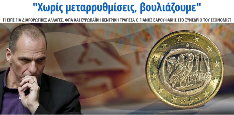 «Τα ομόλογα που διακρατά η ΕΚΤ πρέπει να σταλούν στο απώτερο μέλλον, δήλωσε ο κ. Βαρουφάκης, σε ομιλία του στο συνέδριο του Economist. H φράση του αυτή αναπαρήχθη αμέσως από τα ξένα πρακτορεία τα οποία τονίζουν ότι η Ελλάδα σκέφτεται να μην πληρώσει τα χρέη της το καλοκαίρι, κάτι που προφανώς θα θεωρηθεί πιστωτικό γεγονός.