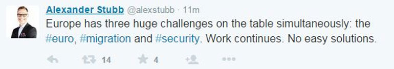 «Η Ευρώπη έχει τρεις τεράστιες προκλήσεις στο τραπέζι ταυτόχρονα. Το ευρώ, τη μετανάστευση και την ασφάλεια. Η δουλειά συνεχίζεται, δεν υπάρχουν εύκολες λύσεις» έγραψε ο Στουμπ στον προσωπικό του λογαριασμό στο συγκεκριμένο μέσο κοινωνικής δικτύωσης.