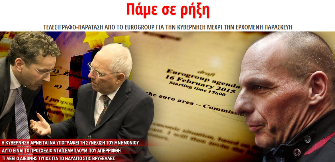 Με το «μαχαίρι στον λαιμό» βρίσκεται, πλέον, η ελληνική κυβέρνηση έπειτα από το σκωτσέζικο ντους που υπέστη στο ΕurogroupΕιδικότερα, η ελληνική κυβέρνηση τονίζει ότι τις τελευταίες ημέρες και ώρες υπήρξε προσπάθεια γεφύρωσης των διαφορών με συνεχείς διαβουλεύσεις της Αθήνας με Ευρωπαίους ηγέτες και αξιωματούχους. Προσθέτει, μάλιστα, ότι το κείμενο που θα αποτελούσε τη βάση συζήτησης στο Eurogroup, και με το οποίο η ελληνική πλευρά ήταν κατ’ αρχάς θετική, αντικαταστάθηκε μ’ ένα τελείως διαφορετικό κείμενο το οποίο εκινείτο σε εκ διαμέτρου αντίθετη κατεύθυνση. Ουσιαστικά, το κείμενο αυτό ζητούσε την παράταση του Μνημονίου.