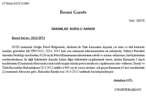 2012/2974 Muğla Petrol Bölgesinde, Akdeniz’de Türk Karasuları Dışında Yer Alan AR/TPO/5033, 5034, 5035 Hak Sıra Numaralı Ruhsatnamelere Ait Sahalarda, Türkiye Petrolleri Anonim Ortaklığı Tarafından Petrol Ameliyatı Yapılmasına İzin Verilmesi Hakkında Karar