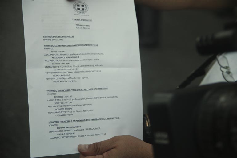 Τα ονόματα των προσώπων που απαρτίζουν το νέο κυβερνητικό σχήμα (ΣΥΡΙΖΑ, ΑΝΕΛ) δόθηκαν στη δημοσιότητα το βράδυ της Παρασκευής. H oρκωμοσία αναβάλλεται για τις 10.30 το πρωί του Σαββάτου, εξαιτίας των ειδικών συνθηκών που έχουν προκληθεί από τις πυρκαγιές.