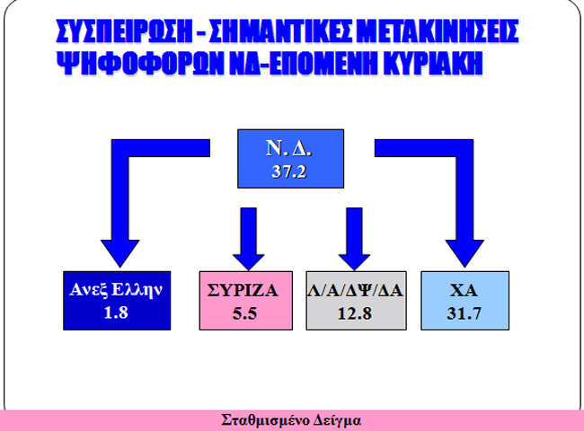 Στις συσπειρώσεις των δύο πρώτων κομμάτων η Νέα Δημοκρατία συγκεντρώνει αυτή τη στιγμή ποσοστό της τάξης του 37,2% με βασική «αιμορραγία» την διαρροή ψηφοφόρων της προς την Χρυσή Αυγή με ποσοστό μάλιστα που ανέρχεται στο 37,1%.