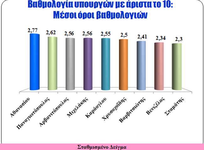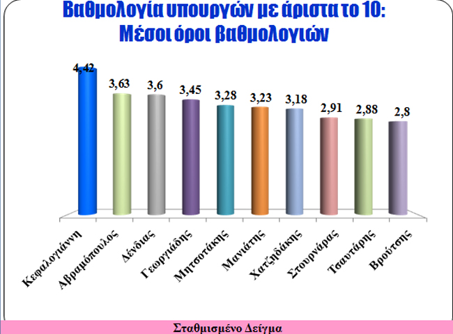 Τέλος η χαμηλή βαθμολογία των υπουργών είναι αναμενόμενη λόγω της οικονομικής κρίσης, της ανεργίας και της φυσιολογικής δυσφορίας των πολιτών. Με άριστα το δέκα πρώτη έρχεται η υπουργός τουρισμού Όλγα Κεφαλογιάννη με το φτωχό 4,42 τρίτος ο Δένδιας, ενώ έκπληξη αποτελεί και η 8η θέση για τον υπουργό Οικονομικών Στουρνάρα.