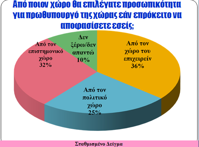 Οι συμμετέχοντες στην ψηφοφορία κλήθηκαν να απαντήσουν την ερώτηση: Από ποιον χώρο θα επέλεγαν μία κατάλληλη προσωπικότητα για πρωθυπουργό της χώρας. Οι περισσότεροι φαίνεται ότι προτιμούν κάποιο πρόσωπο από τον χώρο του επιχειρείν.