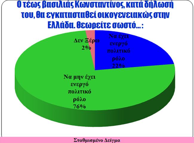 πολιτικά πράγματα του τόπου του τ. Βασιλιά Κωνσταντίνου ενόψει της μετεγκατάστασής του από το Λονδίνο στην Αθήνα. Το 22% επιθυμεί μια τέτοια εμπλοκή κι αυτό σε περίπτωση που ο Κωνσταντίνος αποφασίσει να εμπλακεί είναι φανερό τι μπορεί να σημαίνει, λαμβανομένου υπ’ όψιν του γεγονότος ότι θα αποκτήσει άλλη δυναμική η κίνησή του όταν εκδηλωθεί επίσημα από τον ίδιο.