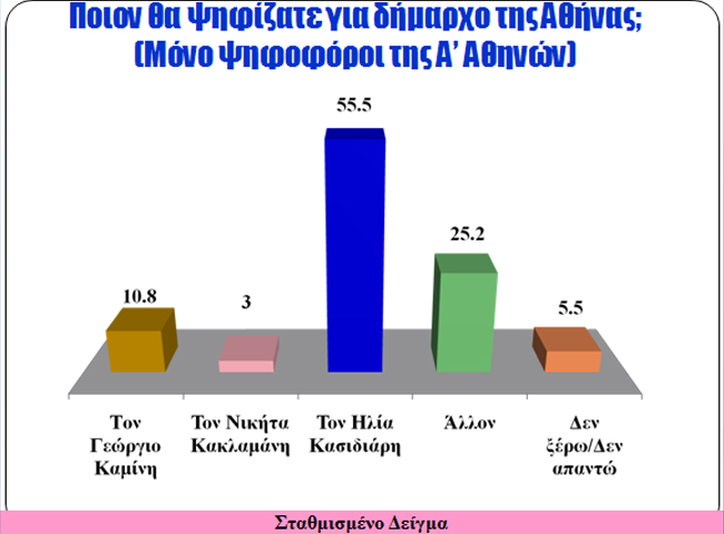 Εντυπωσιακό είναι επίσης το ποσοστό που δίνουν οι ψηφοφόροι στην υποψηφιότητα του Ηλία Κασιδιάρη για τον Δήμο της Αθήνας. Πρόκειται φυσικά για την ψήφο όσων έχουν τα εκλογικά τους δικαιώματα στον Δήμο της Αθήνας, όχι του συνόλου που συμμετείχε από διάφορες περιοχές της χώρας και το 55,5% που δίνουν στον Κασιδιάρη είναι περισσότερο από εντυπωσιακό, σε σχέση με το 25,2% του άλλου (δεν έχουν δηλωθεί όλες οι υποψηφιότητες), το 10,8% του Γιώργου Καμίνη και το πολύ χαμηλό 3% του Νικήτα Κακλαμάνη.