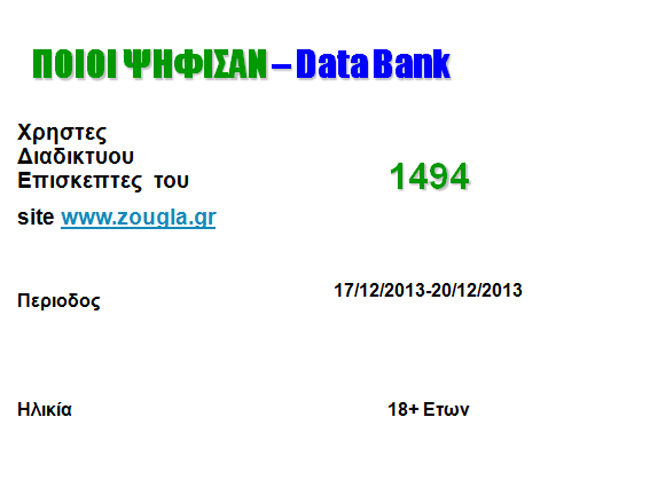 Εντυπωσιακά τα αποτελέσματα της νέας διαδικτυακής ψηφοφορίας που πραγματοποιήθηκε από τις 17/12/2013 έως τις 20/12/2013. Ψήφισαν 1.494 άτομα τα όποια πέραν της πρόθεσης ψήφου απάντησαν και σε μια σειρά ερωτημάτων άμεσα συνδεδεμένων με την επικαιρότητα, όπως η επιστροφή και η εγκατάσταση του τέως στην Ελλάδα, το ενδεχόμενο εμπλοκής του με την πολιτική, οι υποψηφιότητες (Καμίνη, Κασιδιάρη, Κακλαμάνη) για τον Δήμο της Αθήνας και η βαθμολογία των υπουργών της κυβέρνησης.