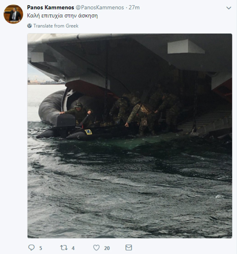 Ο υπουργός Άμυνας Πάνος Καμμένος το πρωί της Τετάρτης ανήρτησε στο διαδίκτυο και ένα tweet ευχόμενος καλή επιτυχία στην άσκηση:
