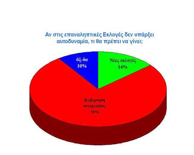 Στο γράφημα που ακολουθεί, το 76% των ερωτηθέντων ζητεί από τις πολιτικές δυνάμεις να συνεργαστούν, αφού, όπως καθίσταται σαφές από τις μέχρι τώρα μετρήσεις, δεν πρόκειται να υπάρξει αυτοδυναμία ενός κόμματος. Η απαίτηση των πολιτών είναι ξεκάθαρη. Μόνον το 14% επιλέγει και τρίτη κατά σειρά προσφυγή στις κάλπες.