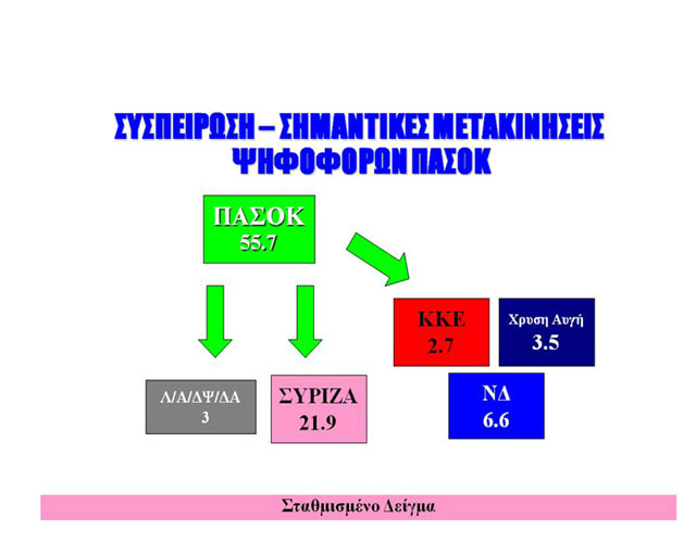 Το ΠΑΣΟΚ δείχνει να φυλλορροεί, καθώς αποτυπώνεται μία ισχυρή διαρροή προς τον ΣΥΡΙΖΑ και μικρότερες προς τη ΝΔ, το ΚΚΕ και τη Χρυσή Αυγή.