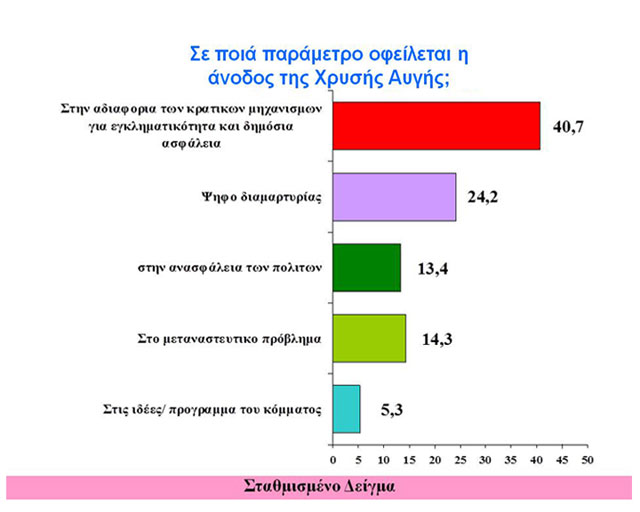 Το 40,7% εξηγεί ότι η βασική παράμετρος που ώθησε τα υψηλά ποσοστά της Χ.Α. είναι η αδιαφορία των κρατικών μηχανισμών για την εγκληματικότητα και τη δημόσια ασφάλεια.