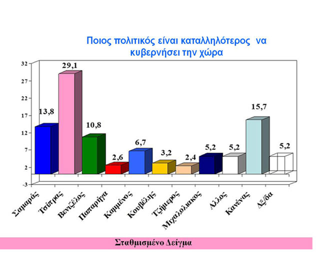 Στη δημοσκόπηση με δείγμα των 885 ατόμων που παρουσιάστηκε στην εκπομπή «Κίτρινος Τύπος» της περασμένης Πέμπτης, ο Αντώνης Σαμαράς ερχόταν πρώτος στην αξιολόγηση των ερωτηθέντων ως προς την καταλληλότητα διακυβέρνησης της χώρας. Στη δεύτερη θέση φιγούραρε ο Αλέξης Τσίπρας και ακολουθούσαν ο Ευάγγελος Βενιζέλος και η Αλέκα Παπαρήγα, με τον Πάνο Καμμένο να περνά στην 5η θέση της αξιολόγησης. Η επιλογή «Κανένας» με 15,7% κινούνταν σε υψηλό ποσοστό.