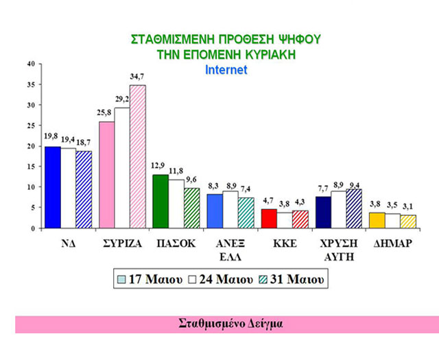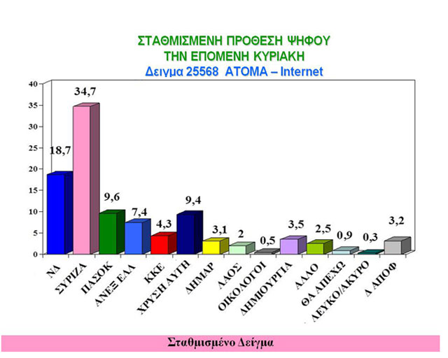 Οι συμμετέχοντες στη μέτρηση αυτή τοποθετούν τον ΣΥΡΙΖΑ στην πρώτη θέση, με μεγάλη διαφορά από τη ΝΔ. Δηλαδή 34,7% έναντι 18,7% της ΝΔ. Η ΝΔ στη μικρή δημοσκόπηση προηγούνταν περίπου με μισή ποσοστιαία μονάδα. Μικρή μείωση παρουσιάζουν τα ποσοστά του ΠΑΣΟΚ, αλλά και του ΚΚΕ.