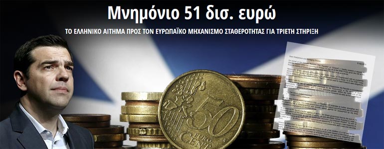 Η αποφυγή χρεοκοπίας της χώρας μας εξαρτάται από την έγκριση του ελληνικού αιτήματος για τριετές δάνειο που θα συνοδεύεται από πρόγραμμα (Memorandum of Understanding) και έχει διαβιβαστεί στον Ευρωπαϊκό Μηχανισμό Σταθερότητας και τους Θεσμούς. Επί της ουσίας πρόκειται για μνημόνιο ύψους 51 δις ευρώ (σ.σ. ίσως και παραπάνω) με σκληρά μέτρα.