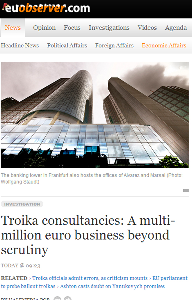 Σκάνδαλο που κόστισε στους φορολογούμενους πολίτες, πάνω από 80 εκατ. ευρώ, αποκαλύπτει το EU Οbserver σε σχέση με τις εργολαβίες που έχουν δώσει κρυφά και χωρίς διαγωνισμό τα στελέχη της τρόικας σε γνωστές εταιρείες για παροχή χρηματοοικονομικών συμβουλών.