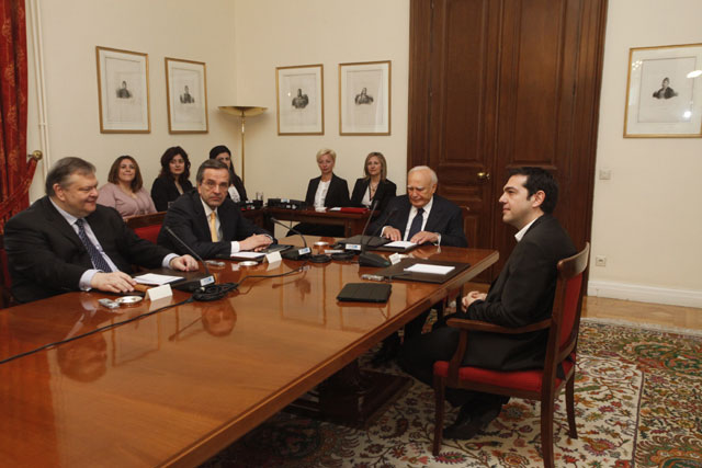 Ο διάλογος μεταξύ του προέδρου της Νέας Δημοκρατίας Αντώνη Σαμαρά, του ΣΥΡΙΖΑ Αλέξη Τσίπρα και του ΠΑΣΟΚ Ευ. Βενιζέλου, σύμφωνα με τα όσα διαρρέει η Νέα Δημοκρατία, έχει ως εξής:
