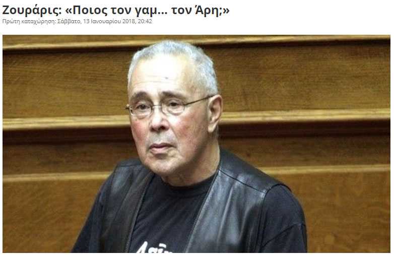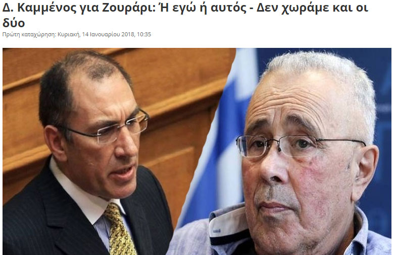 «Ερίδματε (σσ καλοδομημένε) πρωθυπουργέ και σύντροφε υποβάλλω σήμερα 14.1.2018 την από την θέση του υφυπουργού επί της παιδείας παραίτησίν μου, η οποία διευκολύνει, ως εικός την κυβερνητική αλληλεγγύη και, συνάμφω το πολιτικό μου αυτεξούσιον. Μετά της προσηκούσης τιμής, Κώστας Γ. Ζουράρις»