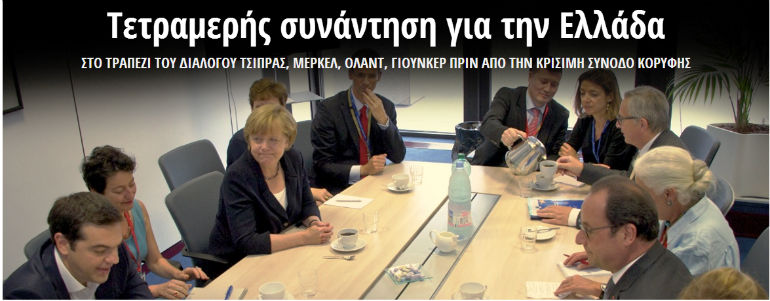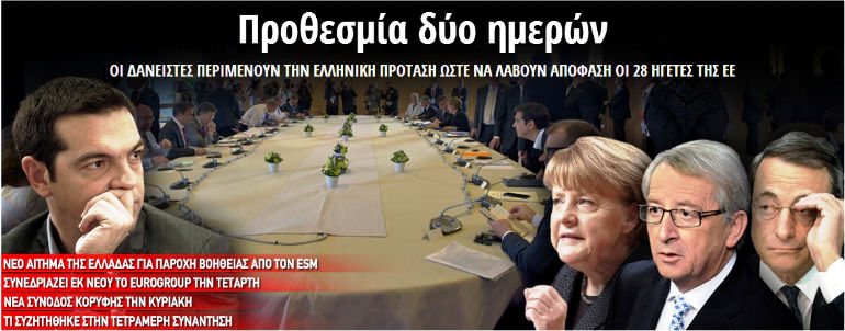 Οι δανειστές απείλησαν -για πρώτη φορά- ανοικτά την Ελλάδα με Grexit, σε περίπτωση που δεν υπάρξει συμφωνία την ΚυριακήΜε την οικονομική ασφυξία να πνίγει καθημερινά την κοινωνία και τον Ντράγκι να κρατά ζωντανές τις τράπεζες μέχρι την Κυριακή, οι Μέρκελ, Τουσκ και Γιούνκερ έδωσαν τελεσίγραφο στην κυβέρνηση, ώστε να καταθέσει την πρότασή της για πρόγραμμα που αυτομάτως θα εξασφαλίσει ρευστότητα, αλλά θα επιφέρει την οικονομική υποταγή στους πιστωτές.