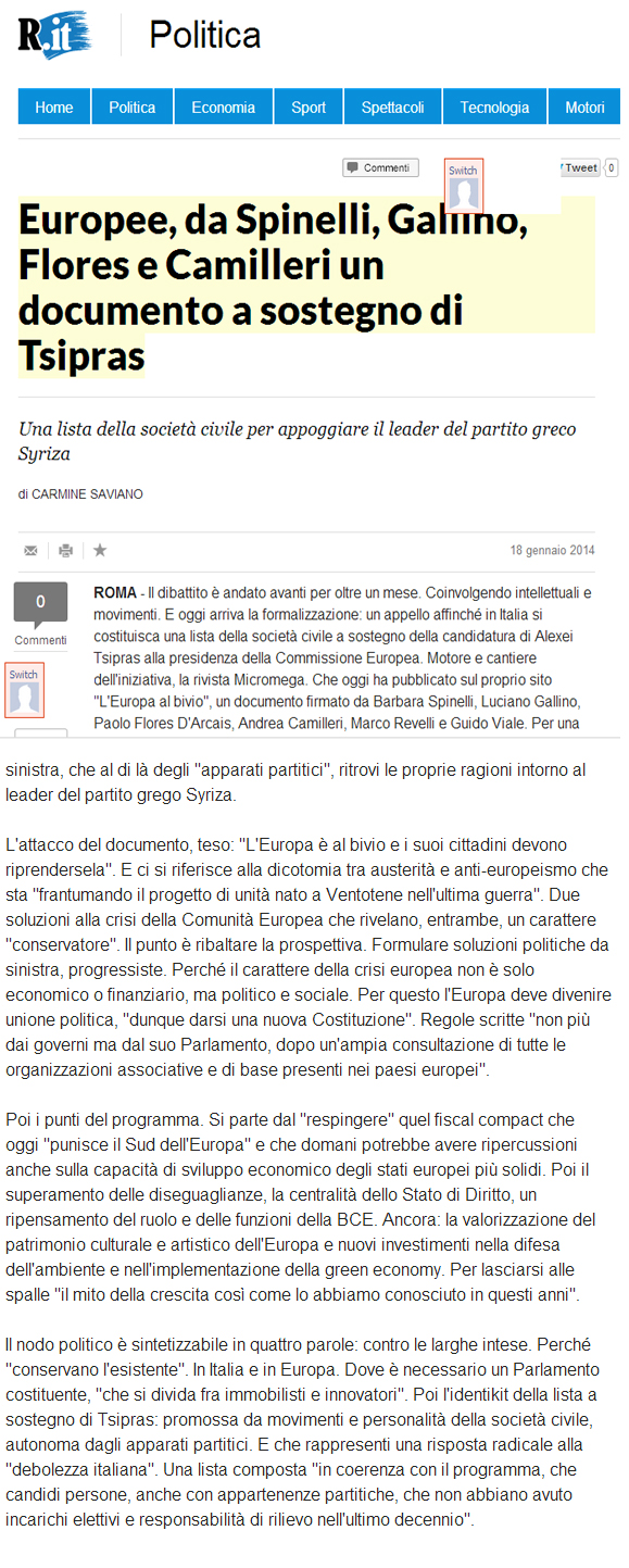 Σε σημερινό σχόλιό της, η ιταλική εφημερίδα «Λα Ρεπούμπλικα» προβάλλει την έκκληση Ιταλών διανοουμένων και καλλιτεχνών υπέρ της υποψηφιότητας του προέδρου του ΣΥΡΙΖΑ Αλέξη Τσίπρα, για την προεδρία της Ευρωπαϊκής Επιτροπής.