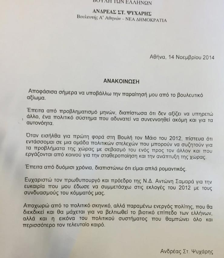 «Έπειτα από προβληματισμό μηνών, διαπίστωσα ότι δεν αξίζει να υπηρετώ άλλο ένα πολιτικό σύστημα που αδυνατεί να συνεννοηθεί ακόμη και για τα αυτονόητα» τονίζει μεταξύ άλλων ο κ. Ψυχάρης.
