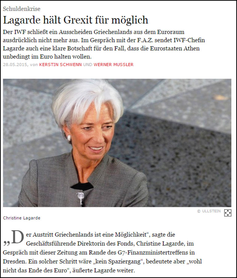 Βόμβα στις κυβερνητικές εξαγγελίες περί επίτευξης συμφωνίας μεταξύ Αθήνας και δανειστών μέσα στις προσεχείς ημέρες έρχεται να βάλει, μέσω συνέντευξής της στην εφημερίδα Frankfurter Allgemeine Zeitung, η γενική διευθύντρια του Διεθνούς Νομισματικού Ταμείου Κριστίν Λαγκάρντ, η οποία χαρακτηρίζει ως πιθανό το ενδεχόμενο Grexit.