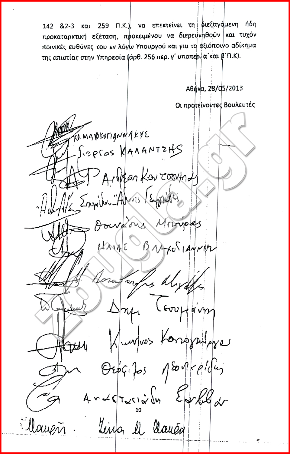 Υπενθυμίζεται πως, μέχρι στιγμής, 54 είναι οι βουλευτές της συγκυβέρνησης, σύμφωνα με πληροφορίες, έχουν υπογράψει την πρόταση της Προανακριτικής Επιτροπής (που διερευνά την υπόθεση της «λίστας Λαγκάρντ») για τη διεύρυνση του κατηγορητηρίου, κατά του πρώην υπουργού Οικονομικών Γιώργου Παπακωνσταντίνου με το αδίκημα της απιστίας σε βαθμό κακούργηματος. Η πρόταση αναμένεται να κατατεθεί εντός της ημέρας, στον πρόεδρο της Βουλής Ευ. Μεϊμαράκη.