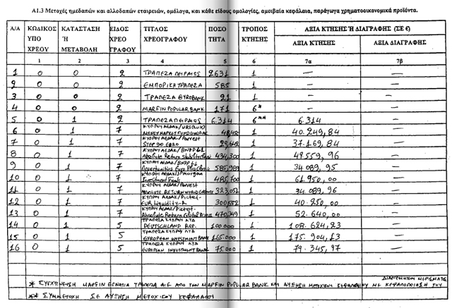 Σύμφωνα με το πόθεν έσχες του, από τις 800.00 ευρώ που κατείχε προ τριετίας, τα περισσότερα τα επένδυσε σε ομόλογα της Τράπεζας Κύπρου, Πειραιώς.