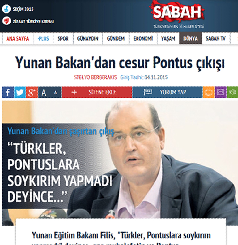 Η τουρκική εφημερίδα Sabah, σε δημοσίευμα που φιλοξενείται στο πρωτοσέλιδό της κάνει λόγο για «γενναία παραδοχή» εκ μέρους του υπουργού Παιδείας.