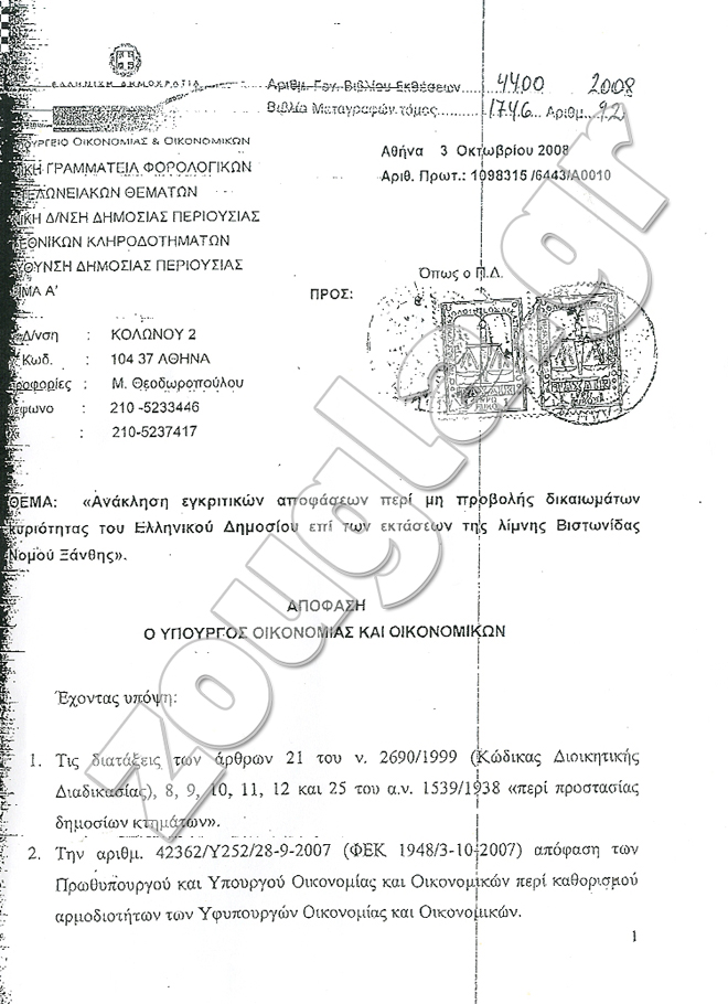 Άπαντες αγνοούσαν (;) ότι η κατοχή της λίμνης Βιστωνίδος απεδόθη από το ελληνικό Δημόσιο, που την κατείχε μη νομίμως, στη Μονή Βατοπεδίου με σύμβαση του 1930, η οποία συνήφθη κατ’ εξουσιοδότηση δυνάμει του νομοθετικού διατάγματος 8/4/24.