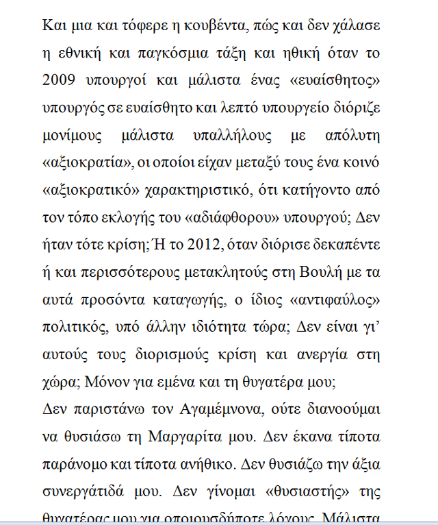 Ο Βύρων Πολύδωρας δηλώνει ευθαρσώς πως ό,τι έκανε για την τοποθέτηση της θυγατρός του στη Βουλή ήταν απολύτως νόμιμο και ηθικό και ξεκαθαρίζει πως δεν το παίζει Αγαμέμνων και άρα δεν προτίθεται να θυσιάσει τη… Μαργαρίτα του.
