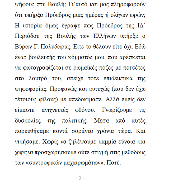 Τα βέλη, όμως, του Βύρωνα Πολύδωρα εκτοξεύονται και κατά του τότε υπουργού Παιδείας Άρη Σπηλιωτόπουλου, τον οποίο μάλιστα αποκαλεί «αυτόν με το μπουρνούζι», αναφερόμενος προφανώς και σαφέστατα σε μία φωτογράφισή του, η οποία είχε προκαλέσει πριν από χρόνια αναταράξεις στη Νέα Δημοκρατία.