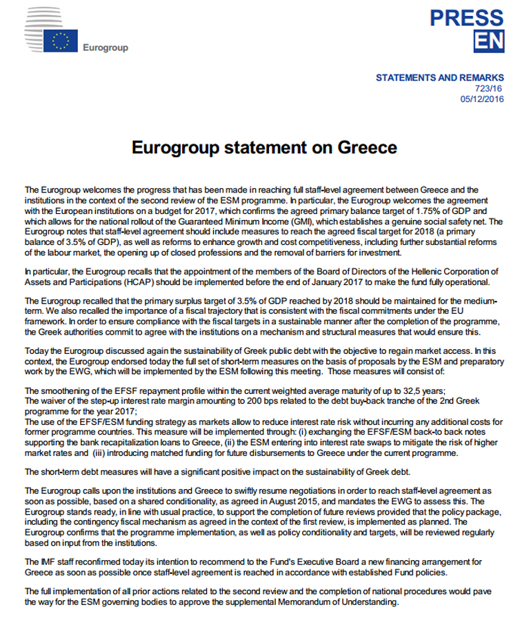 «Το Eurogroup καλωσορίζει την πρόοδο που έχει σημειωθεί στην επίτευξη πλήρους συμφωνίας σε τεχνικό επίπεδο (Staff Level Agreement) μεταξύ της Ελλάδας και των θεσμών στο πλαίσιο της δεύτερης αξιολόγησης του προγράμματος του ESM. Ειδικότερα, το Eurogroup καλωσορίζει τη συμφωνία με τους ευρωπαϊκούς θεσμούς όσον αφορά στον προϋπολογισμό του 2017, ο οποίος επιβεβαιώνει τον συμφωνηθέντα στόχο για πρωτογενές πλεόνασμα 1,75% του ΑΕΠ και επιτρέπει την υιοθέτηση του εθνικού Ελάχιστου Εγγυημένου Εισοδήματος (ΕΕΕ), που δημιουργεί ένα πραγματικό δίχτυ κοινωνικής ασφάλειας.
