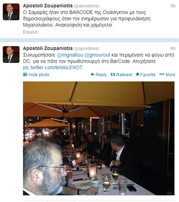Την ώρα που ανακοινώθηκε η απόφαση για την προφυλάκιση του γενικού γραμματέα της Χρυσής Αυγής Νίκου Μιχαλολιάκου, ο Αντώνης Σαμαράς δειπνούσε με δημοσιογράφους στο εστιατόριο Barcode στην Ουάσινγκτον.