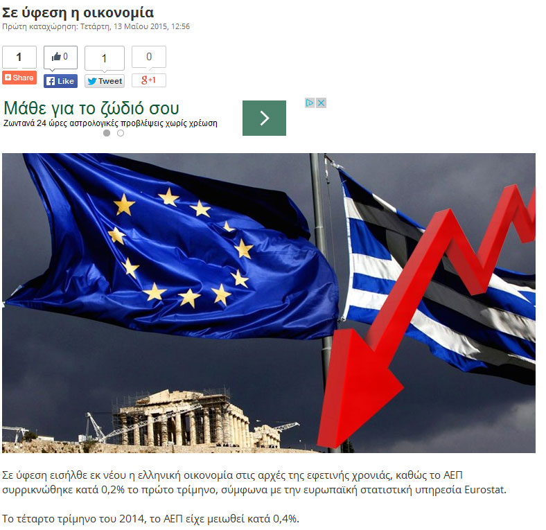 Την ίδια ώρα, προβληματισμός επικρατεί στο κυβερνητικό στρατόπεδο μετά τη δημοσιοποίηση των οικονομικών στοιχείων από την ΕΛ.ΣΤΑΤ., τα οποία δείχνουν ύφεση 0,2% το πρώτο τρίμηνο του 2015. Τα δεδομένα αυτά αποτυπώνουν ανάγλυφα το κλίμα αβεβαιότητας λόγω της παρατεταμένης διαπραγμάτευσης, η οποία οδηγεί σε περαιτέρω εξασθένιση της οικονομικής δραστηριότητας.