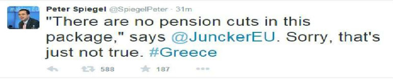 Την αντίδραση του ανταποκριτή των Financial Times στις Βρυξέλλες, Peter Spiegel προκάλεσε η αποστροφή του λόγου του Ζαν Κλοντ Γιούνκερ, σύμφωνα με την οποία του πακέτο που κατέθεσε προς την ελληνική κυβέρνηση δεν περιελάμβανε μειώσεις σε συντάξεις.