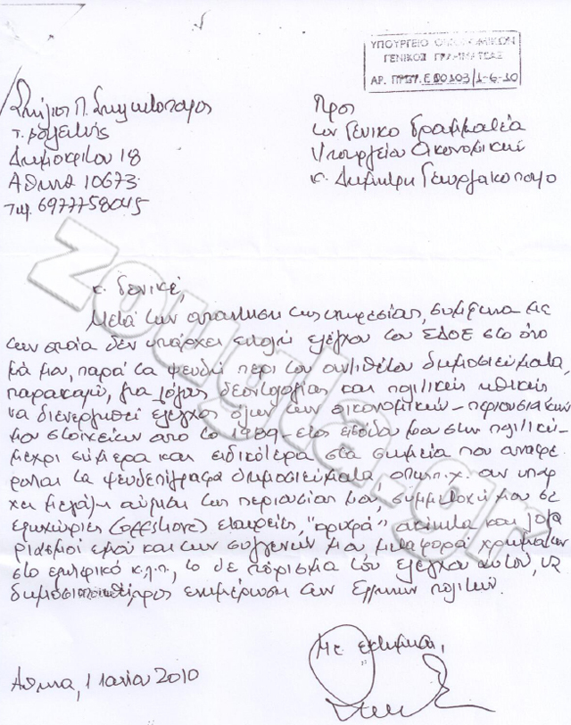 Στον κατάλογο των προσώπων που ελέγχονται από το ΣΔΟΕ -το οποίο πλέον υπάγεται στην αρμοδιότητά σας- αναφέρεται και το όνομά μου, ύστερα από ανώνυμες και παντελώς αστήρικτες καταγγελίες, αφού, εκτός των άλλων, οι καταγγέλλοντες πολίτες (;) προφανώς αγνοούν ότι ο Ραδιοφωνικός Σταθμός 9,84 διοικείται από πρόεδρο και Διοικητικό Συμβούλιο διαπαραταξιακό. Ο εκάστοτε δήμαρχος ουδεμία σχέση έχει με την οικονομική διαχείριση του σταθμού.