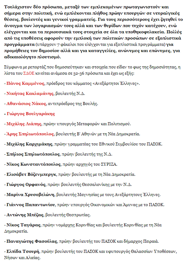 Τα πολιτικά ονόματα που περιλαμβάνονται στη λίστα αγγίζουν τα 36. Οι έρευνες και οι έλεγχοι πραγματοποιούνται από τις περιφερειακές Διευθύνσεις του ΣΔΟΕ σε Πελοπόννησο, Στερεά Ελλάδα, Βόρειο Αιγαίο, Θεσσαλία, από το ΣΔΟΕ Θεσσαλονίκης και από τις κεντρικές υπηρεσίες του Σώματος στην Αθήνα.