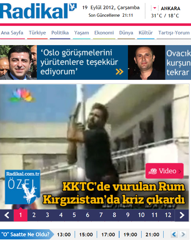 Η Radikal στο πρωτοσέλιδο άρθρο της αναφέρει: Κρίση στο Κιργιστάν για το «χτύπημα» κατά του Ελληνοκυπρίου.