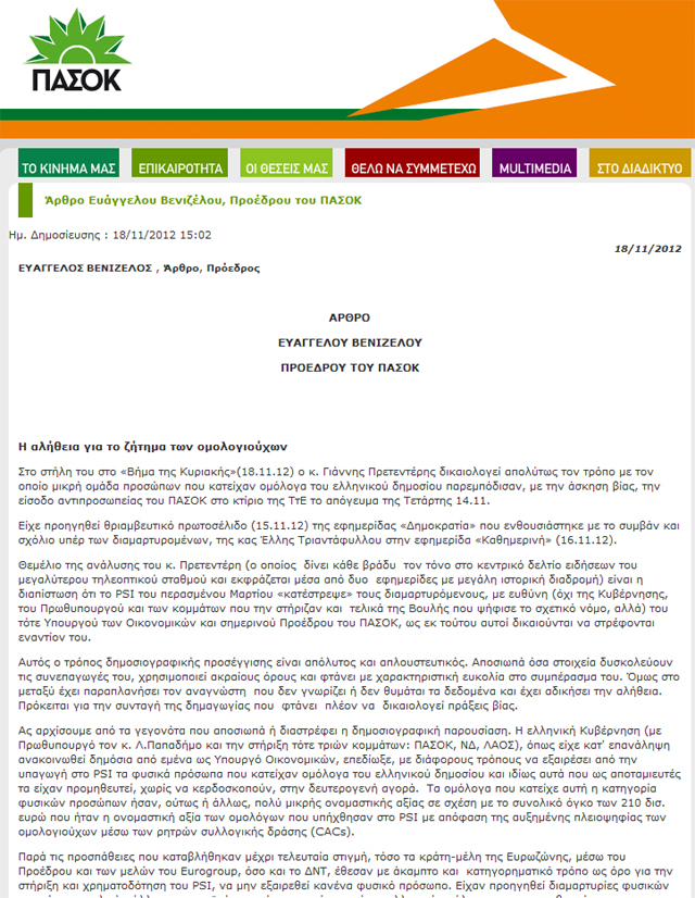 Οι ομολογιούχοι… ομολογούν τη δική τους αλήθεια, η οποία έρχεται σε ευθεία αντιπαράθεση με εκείνη που υποστήριξε ο πρόεδρος του ΠΑΣΟΚ, Ευάγγελος Βενιζέλος σε άρθρο του με τίτλο: «Αλήθεια για το ζήτημα των ομολογιούχων».