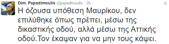 «Η όζουσα υπόθεση Μαυρίκου, δεν επιλύθηκε όπως πρέπει, μέσω της δικαστικής οδού, αλλά μέσω της Αττικής Οδού. Τον έκαψαν για να μην τους κάψει», ήταν το επίμαχο tweet του κ. Παπαδημούλη που προκάλεσε θύελλα αντιδράσεων.