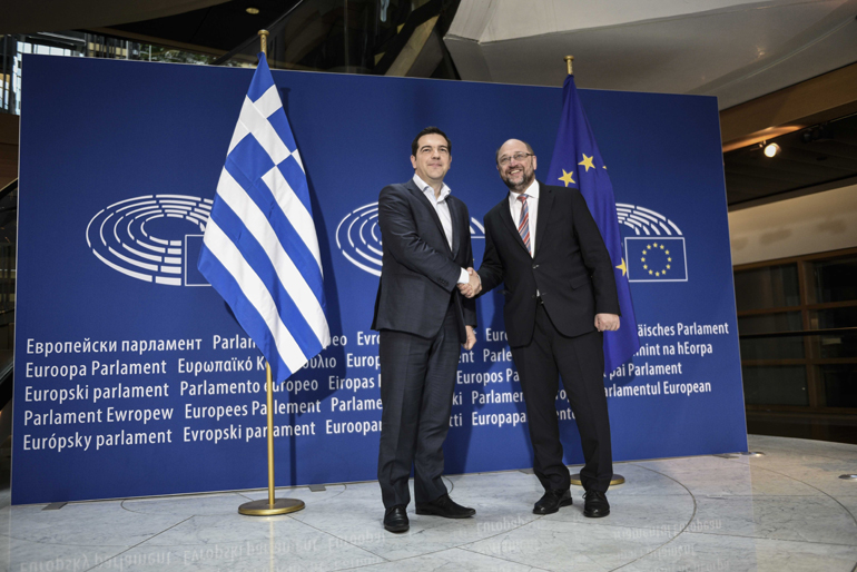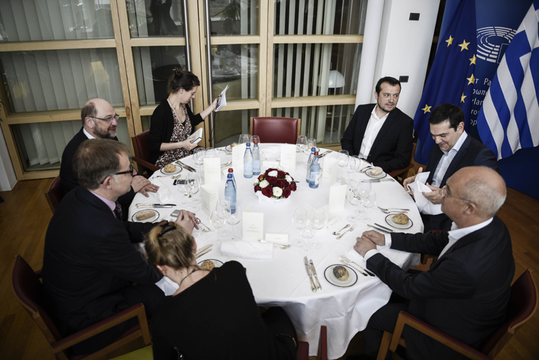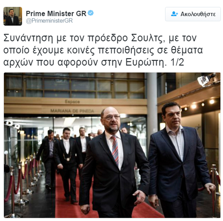 – «Συνάντηση με τον πρόεδρο Σουλτς, με τον οποίο έχουμε κοινές πεποιθήσεις σε θέματα αρχών που αφορούν στην Ευρώπη».