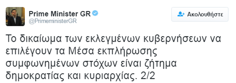 Σε δεύτερο tweet του, ο πρωθυπουργός υπογραμμίζει ότι «το δικαίωμα των εκλεγμένων κυβερνήσεων να επιλέγουν τα μέσα εκπλήρωσης συμφωνημένων στόχων είναι ζήτημα δημοκρατίας και κυριαρχίας».