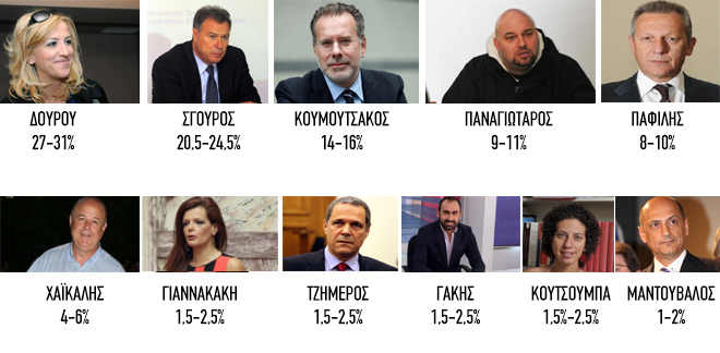 ακολουθούν ο Γ. Σακελλαρίδης με 20% και ο Άρης Σπηλιωτόπουλος με 16,92%, ενώ πολύ κοντά βρίσκεται και ο υποψήφιος της Χ.Α. Ηλίας Κασιδιάρης με 16,11%.