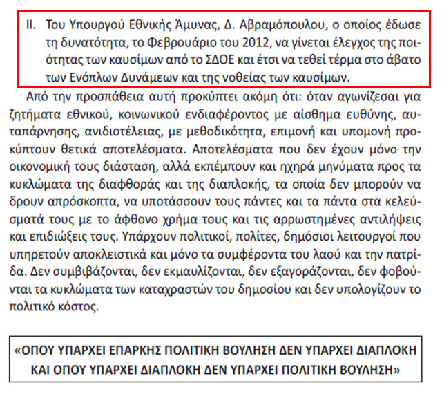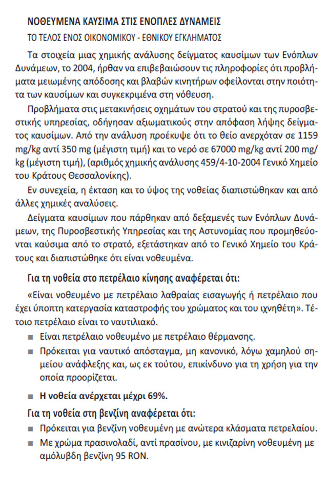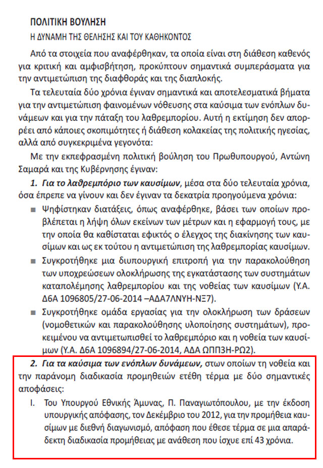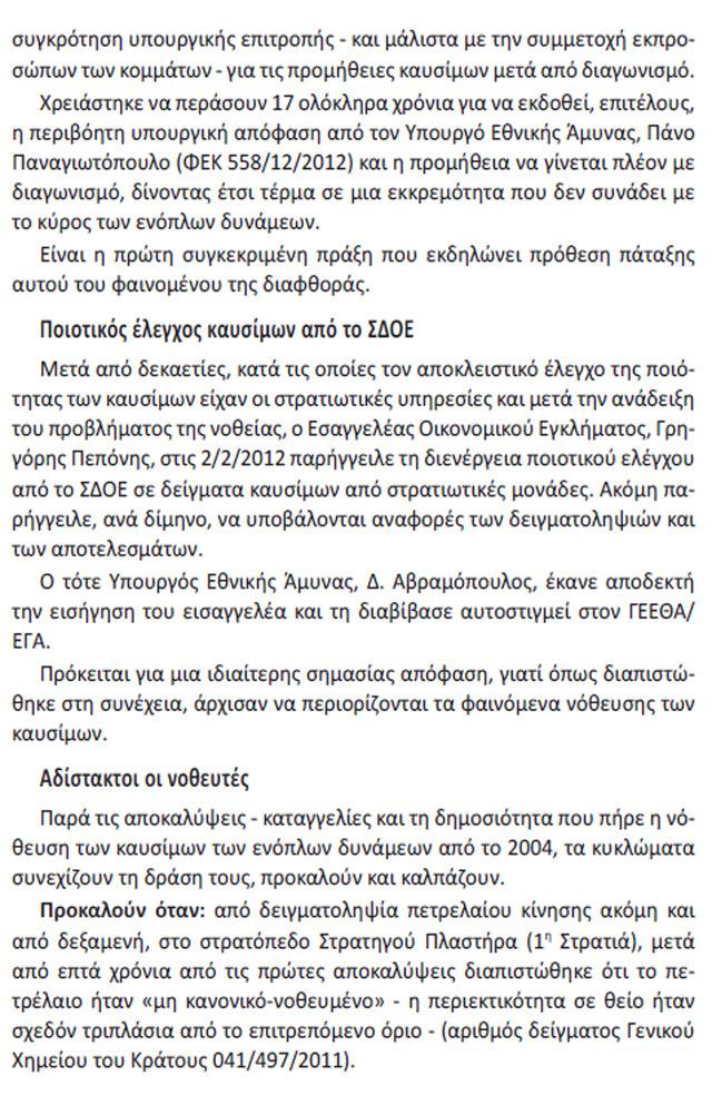 Ωστόσο, η έκθεση επιφυλάσσει θετικές διαπιστώσεις στον τομέα της νοθείας καυσίμων των Ενόπλων Δυνάμεων και αναφέρει συγκεκριμένα ότι για το λαθρεμπόριο καυσίμων, μέσα στα δύο τελευταία χρόνια, έγιναν όσα έπρεπε να γίνουν τα δεκατρία προηγούμενα χρόνια. Ψηφίστηκαν δηλαδή διατάξεις για να είναι εφικτός ο έλεγχος της διακίνησης των καυσίμων, συγκροτήθηκε διυπουργική επιτροπή για την παρακολούθηση των υποχρεώσεων ολοκλήρωσης της εγκατάστασης συστημάτων καταπολέμησης λαθρεμπορίου και της νοθείας των καυσίμων και συγκροτήθηκε ομάδα εργασίας για την ολοκλήρωση των δράσεων (νομοθετικών και παρακολούθησης υλοποίησης συστημάτων) προκειμένου να αντιμετωπιστεί το λαθρεμπόριο και η νοθεία καυσίμων. Γίνεται μνεία στους πρώην υπουργούς Εθνικής Άμυνας, Πάνο Παναγιωτόπουλο, γιατί υπέγραψε το 2012 υπουργική απόφαση για την προμήθεια καυσίμων με διεθνή διαγωνισμό και Δημήτρη Αβραμόπουλο, γιατί τον Φεβρουάριο του 2012 έδωσε τη δυνατότητα να γίνεται έλεγχος ποιότητας των καυσίμων από το ΣΔΟΕ για να τεθεί τέρμα στο άβατο των Ενόπλων Δυνάμεων και της νοθείας καυσίμων.