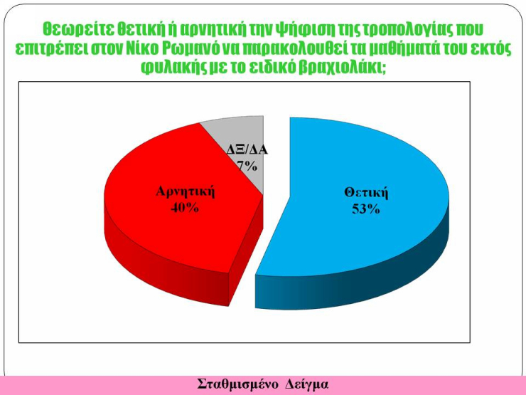 Οι πολίτες θεωρούν ότι η ψήφιση της σχετικής τροπολογίας που θα επιτρέπει στον Ν. Ρωμανό να παρακολουθήσει τα μαθήματά του, φορώντας ειδικό βραχιολάκι, είναι θετική.