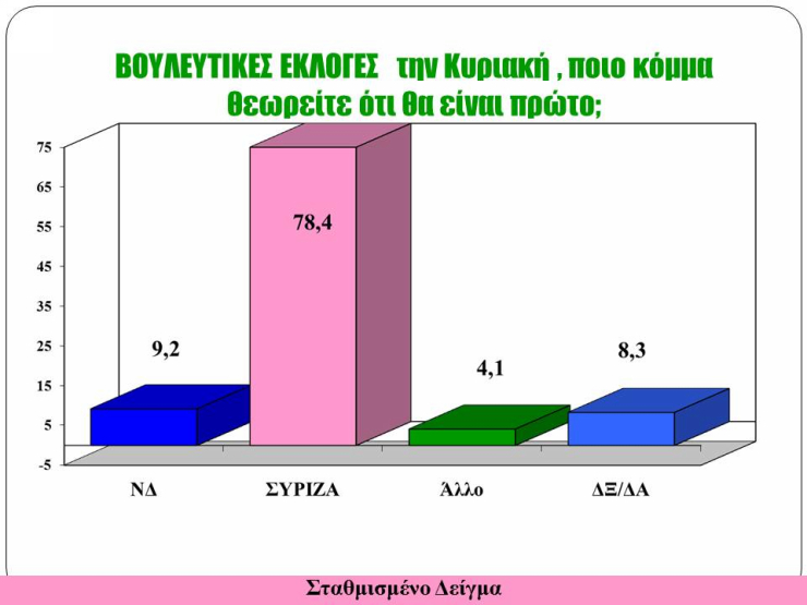 Το επόμενο ερώτημα αφορά στην παράσταση νίκης για τις εκλογές, δηλαδή εάν αυτές διεξάγονταν την επόμενη Κυριακή, ποιο κόμμα θα ερχόταν πρώτο. Ο ΣΥΡΙΖΑ κόβει πρώτος το νήμα με 78,4%, ενώ η ΝΔ ακολουθεί με 9,2%.