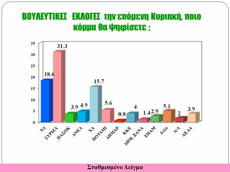 Ο ΣΥΡΙΖΑ καταλαμβάνει την πρώτη θέση με ποσοστό 31,3%, ενώ δεύτερη έρχεται η Νέα Δημοκρατία με 18,6%. Τρίτο κόμμα αναδεικνύεται η Χρυσή Αυγή με 15,7%, ακολουθούν το Ποτάμι με 5,6% και οι Ανεξάρτητοι Έλληνες με 4,9%, το ΚΚΕ αποσπά 4% και εν συνεχεία το ΠΑΣΟΚ λαμβάνει 3,9%. Η ΔΗΜΑΡ ανιχνεύεται μετά βίας.