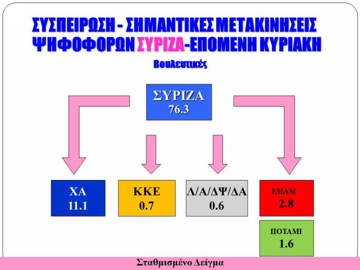 Αντίθετα, η συσπείρωση δυνάμεων στον ΣΥΡΙΖΑ εμφανίζεται στο 76,3%. Αξιοσημείωτη είναι η διασπορά ψηφοφόρων του προς τη Χρυσή Αυγή, που είναι της τάξεως του 11,1%.