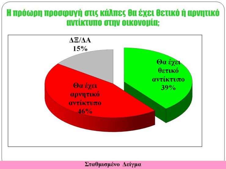 Στο δεύτερο ερώτημα περί θετικού ή αρνητικού αντικτύπου στην οικονομία σε περίπτωση εκλογών, οι πολίτες πιστεύουν κατά 46% ότι θα υπάρξει πρόβλημα, ενώ το 39% υποστηρίζει ότι οι κάλπες θα πυροδοτήσουν θετικές εξελίξεις. Ωστόσο, σε αυτό το σημείο παρατηρείται μία αντίφαση. Είναι φανερό ότι η πλειοψηφία επιθυμεί την προσφυγή στις κάλπες, θεωρώντας ωστόσο ως δεδομένο ότι οι εκλογές θα επηρεάσουν αρνητικά την οικονομία.