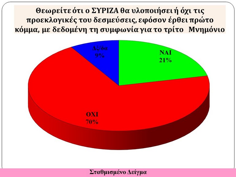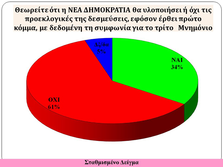 Το τρίτο ερώτημα της παρούσας έρευνας αφορούσε στο κατά πόσο το εκλογικό σώμα πιστεύει ότι ΣΥΡΙΖΑ και ΝΔ θα υλοποιήσουν τις προεκλογικές τους δεσμεύσεις, εφόσον κόψουν πρώτοι το νήμα του τερματισμού.